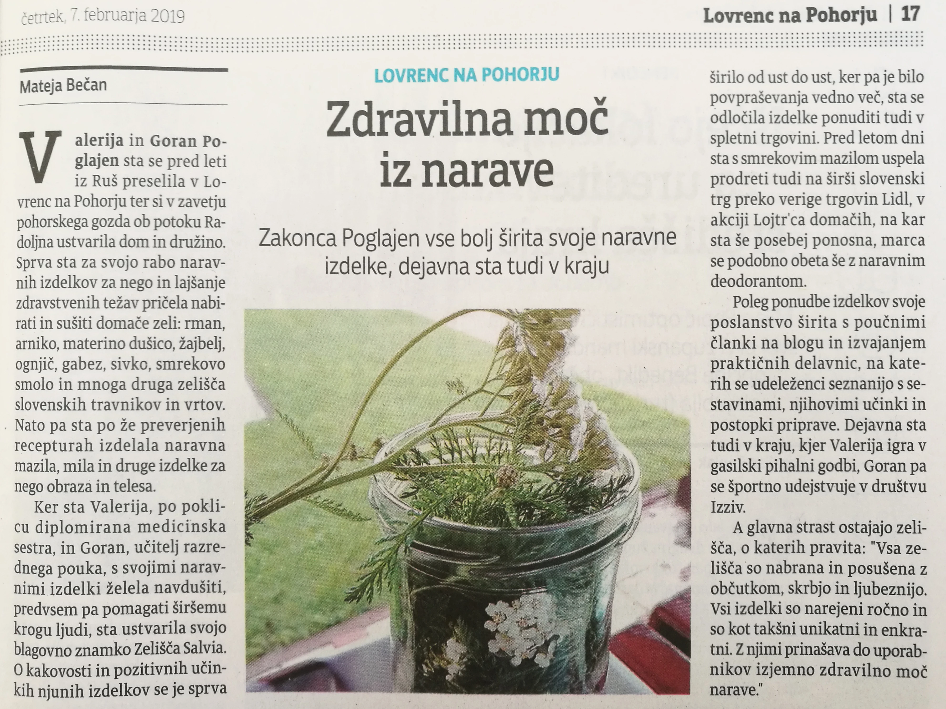 Dragi prijatelji in uporabniki najinih izdelkov. V prilogi Večera Štajer'c je objavljen članek o naju in najinih izdelkih. Kot piše tudi v članku, sva neizmerno vesela in ponosna, da lahko skozi najine izdelke ustvarjava pristen stik med naravo in zdravjem. Z ljubenzijo ustvarjava nove izdelke in hkrati sva zelo ponosna, da kvaliteto v njih prepopznate tudi drugi. Ponosna na Lidlovo Lojt'ro domačih, kjer bo v novi sezoni predstavljen tudi najin naravni deodorant. Zahvala gre tudi kraju in prijetnim ljudem, ki se tukaj trudijo ustvarjati prihodnost. Hvala Anžeju in Mateji za podporo in objavo. Lovrenčani smo lahko ponosni na biser, ki ga tukaj imamo in hvaležni, da ga bomo v prihodnosti lahko še dodobra izbrusili.
