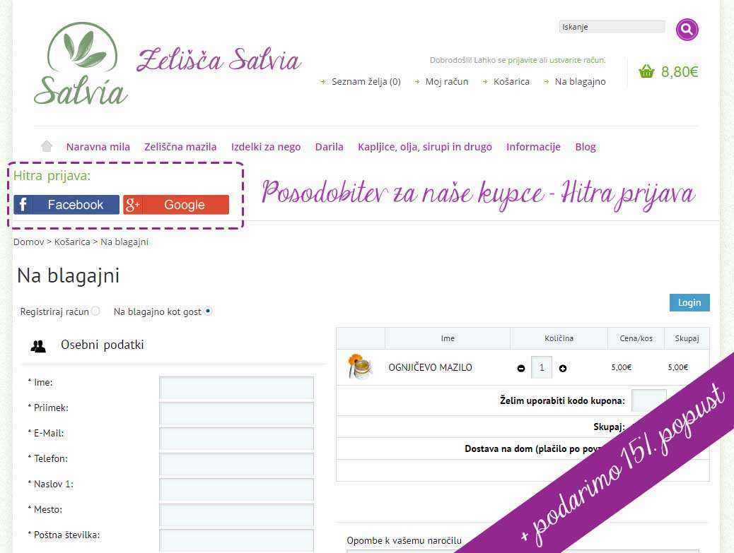 Želimo vam zagotoviti odlično uporabniško izkušnjo v naši spletni trgovini, zato smo že pred časom izboljšali našo hitro blagajno, danes predstavljamo hitro prijavo s socialnima omrežjema facebook in google.