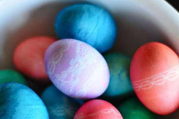 Jajca zavite v čipko in jih pobarvajte. Pri tem postopku ne morete uporabiti barve za jajca, saj se ne bo videla. Potrebno je uporabiti kis, vrelo vodo in barvo za hrano, kot so to naredili pri diytilwedie.blogspot.com.