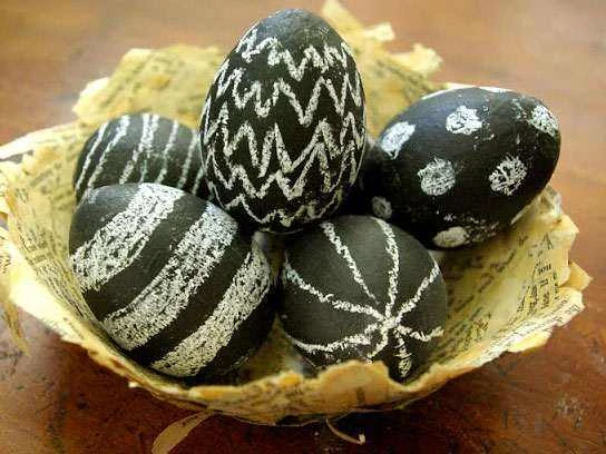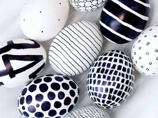 Enostavna ideja, pri kateri potrebujete le bela jajca, ki jih lahko kupite pri katerem od naših večjih trgovcev in črn alkoholni flomaster. Na blogu Obviously Sweet so takšna jajca z črtastimi in pikčastimi vzorci zelo elegantna, lepa in moderna.