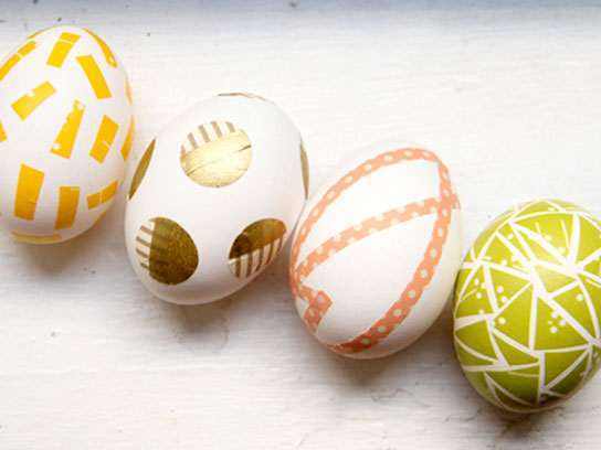 Uporabite barvni, vzorčasti ali pastelni okrasni lepilni trak po vzoru Lovely Indeed. Razrežite trak na različne velikosti in oblike in ga enostavno prilepite na jajca, ki so lahko pobarvana ali ne.